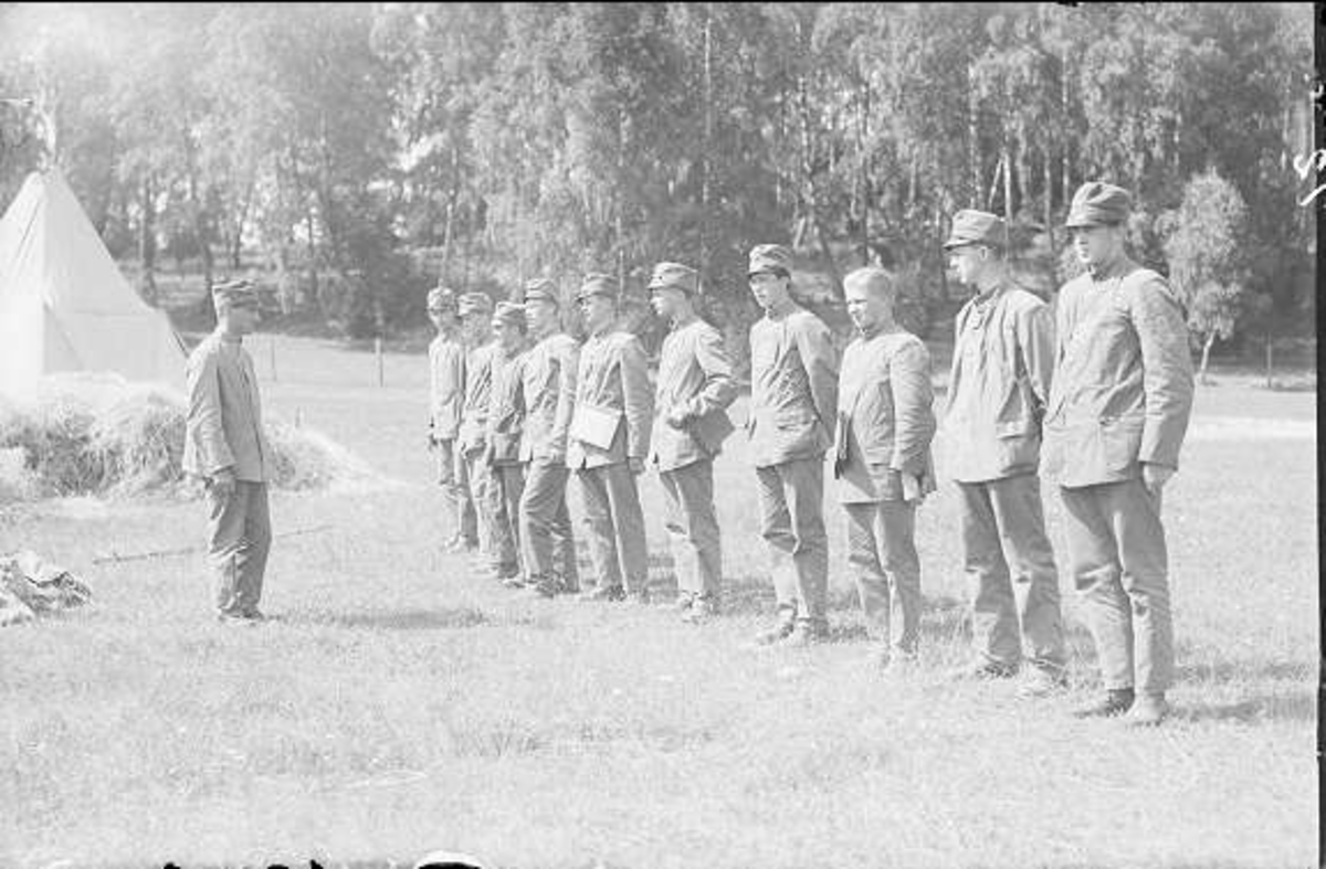 Uppställning i bivacken. Mössa m/23, uniform linnekläder.