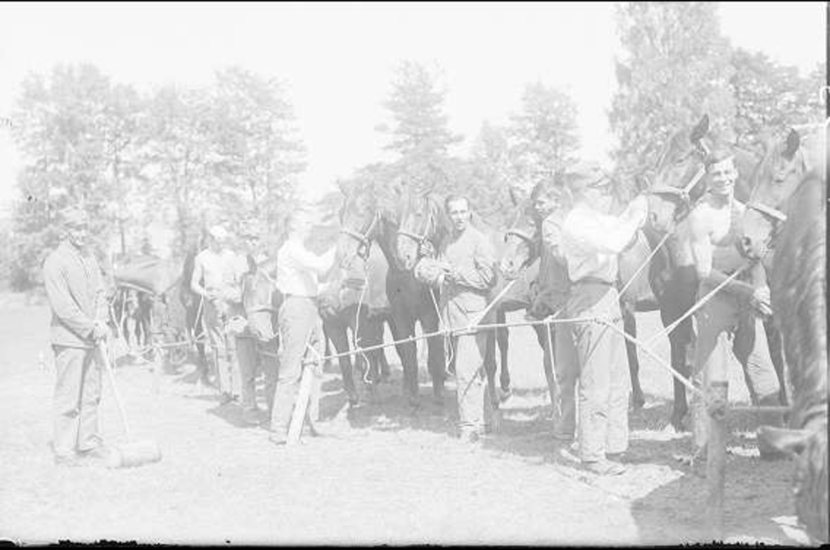 Hästvård i bivacken. Hästarna bundna vid krubblina.