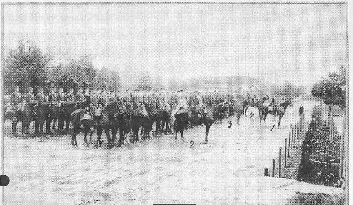 K3. Livhusarer uppställda till häst. Värnpliktsskvadron på Sannahed på fälttjänstövning vid Medevi, där bilden är tagen. 1. Skvch W von Essen, 2. Troppchef Lt N O Palmstierna, 3. J R Bäckström, 4. Reservunderlt. B J Bergman.