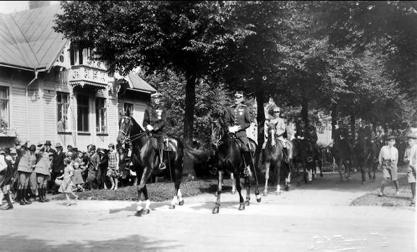 Gustaf V:s och prins Carls besök i Skövde med anl av Skaraborgs regementes 300-årsjubileum. Här på Trädgårdsgatan före korsningen av Borgmästargatan.