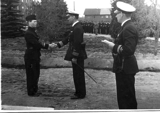F6 Karlsborg 1940. Den 25 maj meddelades krigsmanserinran till nyinrykta värnpliktiga på F6, i samband med en fältgudstjänst. Samtidigt utdelades för första gången flygarmärke i silver m/36 som här överlämnas av chefen F6, överstelöjtnant John Stenbeck till vpl. Korpralen 796 Alm. Albumet är en del av en donation från Karl-Axel Hansson, Karlsborg. Förteckning över hela donationen finns i albumet, samt som Word-dokument.