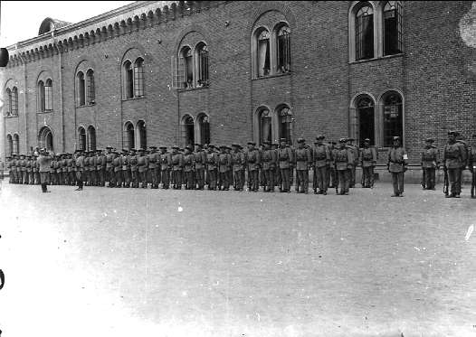 Fästningen. Skyddspluton Ing 2 färdigrustad och klar för avresa från Karlsborg vid krigsutbrottet 2 augusti 1914. Kårchefen håller avskedstal vid uppställning utanför slutvärnet.