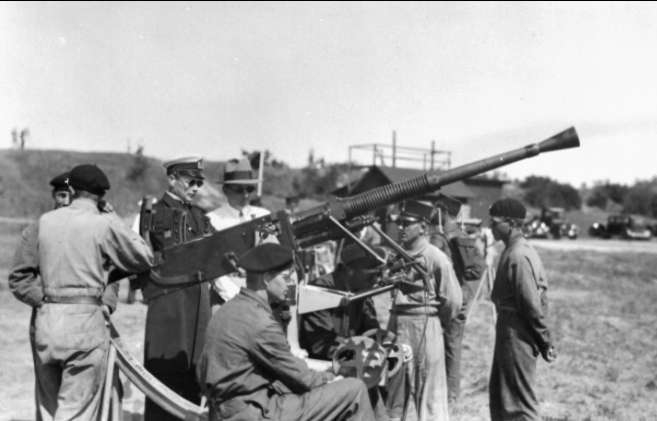 Försök med 40 mm lv-kanon år 1932. Två experter från marinen resp. AB Bofors. Pjäschef var furir Schultzén (bakom i mössa m/ä). Förstoring 25 x 40 cm.