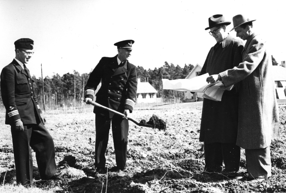 F6 Karlsborg 1949. Det första spadtaget för de 4 husen som skulle byggas för i första hand flottiljens anställda. Från vänster: Intendenten kapten Erik Bodin, chefen F6 överste Sten Gösta Hård, byggmästaren Birger Andersson, verkmästaren Åberg. Albumet är en del av en donation från Karl-Axel Hansson, Karlsborg. Förteckning över hela donationen finns i albumet samt som Word-dokument.