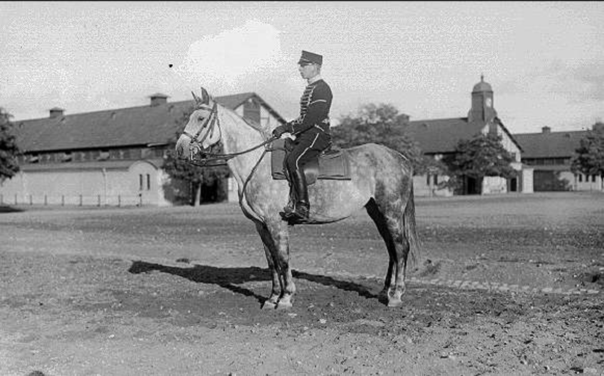 Livhusar på tilldelad stamhäst på kaserngården söder om skvadronens stall.
