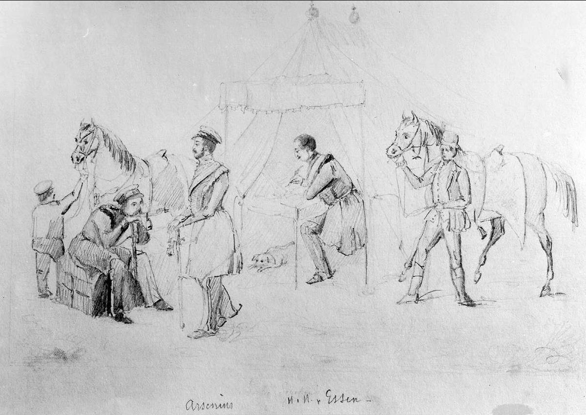 John Arsenius, född 1818. Officer vid K 3 1838-1868. Känd konstnär, framför allt hästmålningar. Söner: Georg -- Konstnär. Sam -- Officer, fältjägare. John Arsenius finns också med på bilden(självporträtt)