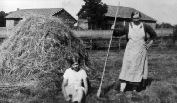 Höskörd på Vaberget år 1930. Anna och Hulda Gustavsson (mor och dotter). Förstoring 29 x 40 cm. Neg finns.
