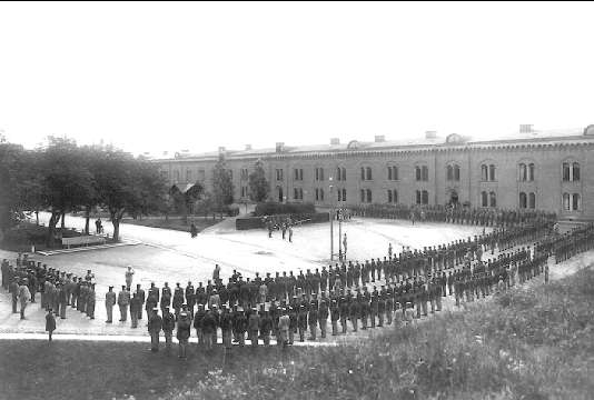 Ingenjörkåren, gudstjänst framför götiska valvet 1925. Musikpaviljongen framför slutvärnet till vänster.