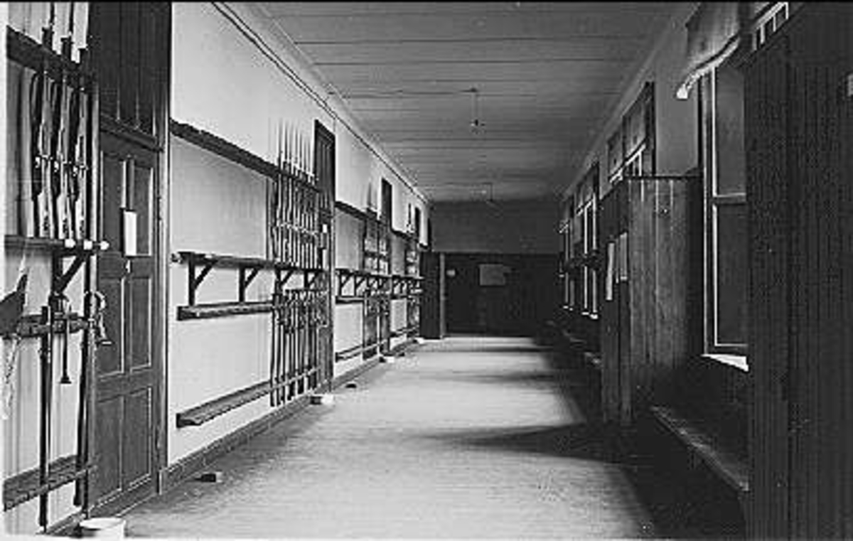 Skvadronkorridoren med karbin med slutstycke och sablar. Allt utan lås. Man litade på folk på den tiden.