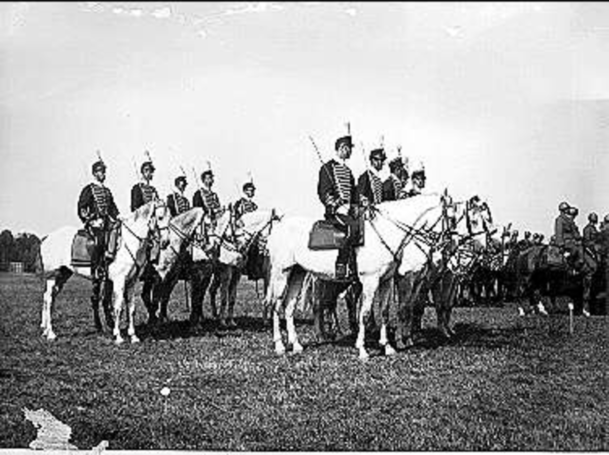 K 3 sommarmarsch till Sanna hed 1947. Standarvakten, till major Sven Littorins stora tillfredsställelse, enbart vita hästar.