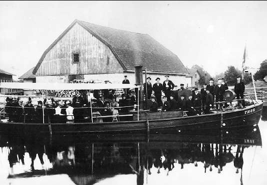 Forsvik omkr 1900. Här har man lånat brukets bogserbåt "Thor" för en söndagsutflykt på viken. Skeppare Göta kanal-bolagets lots Alexander Ericsson, han ses stå i trappan som leder ned till maskin. Järn eller "sinkboden" i bakgrunden.