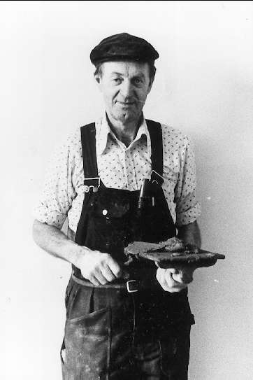 Carl Harry Stålhane under arbete med relief i smält urberg kallad "De som byggde fästningen". Finns vid staben i slutvärnet.