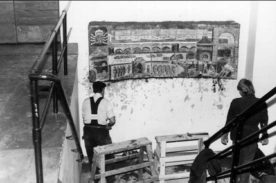 Carl Harry Stålhane under arbete med relief i smält urberg kallad "De som byggde fästningen". Finns vid staben i slutvärnet.