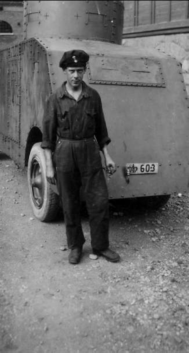 Arbetsdräkt för värnpliktig tjänstgörande vid pansarbilavdelningen.
