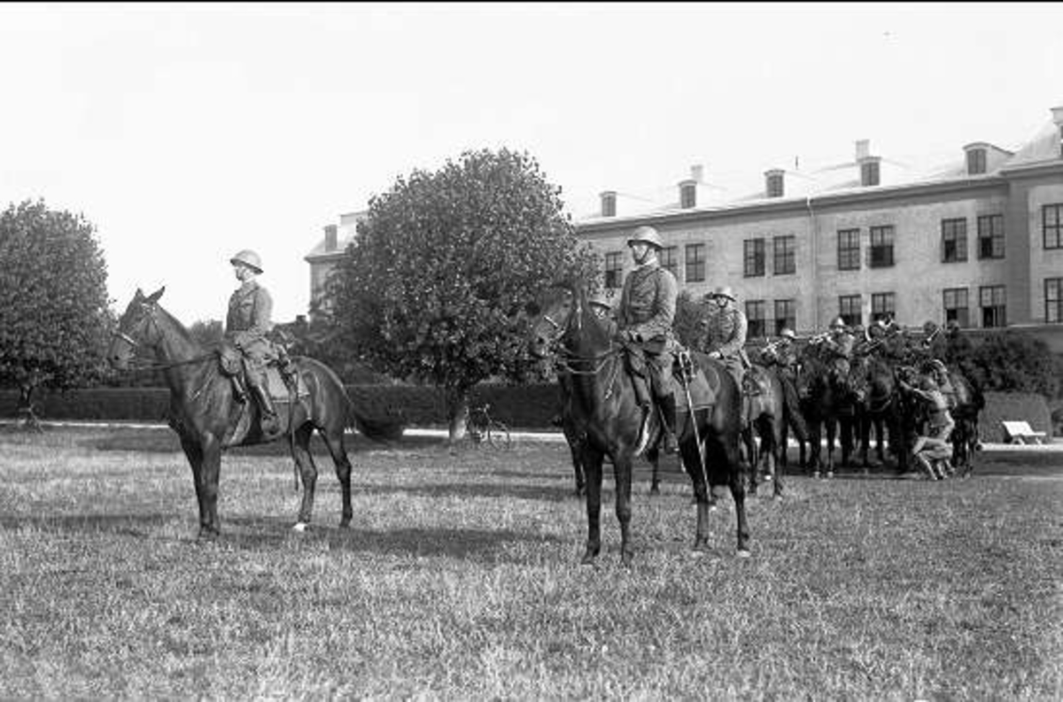 Korum före sommarmarschens början. Avlämning till sekundchefen överste Henry Peyron. Till höger om honom adjutanten löjtnant Sven Littorin . Bakom dem officer till förfogande ryttm. Bertil Sandström.