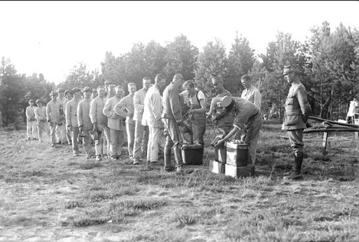 Utspisning av livskvadronen i bivacken vid Tärnet, Hanken, Karlsborg under sommarmarschen 1929.