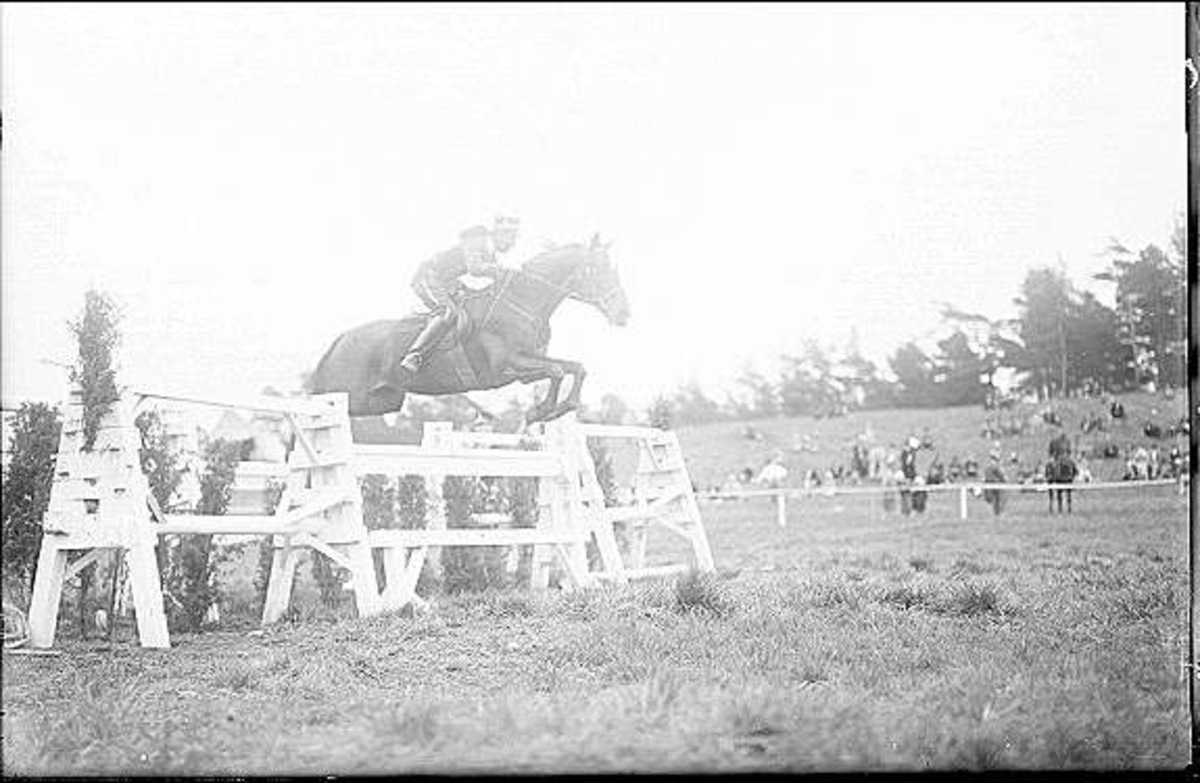 Skövde fältrittklubbs tävlingar 1934 på prishoppningsbanan öster om kasern. I bakgrunden Dunkehallsåsen.