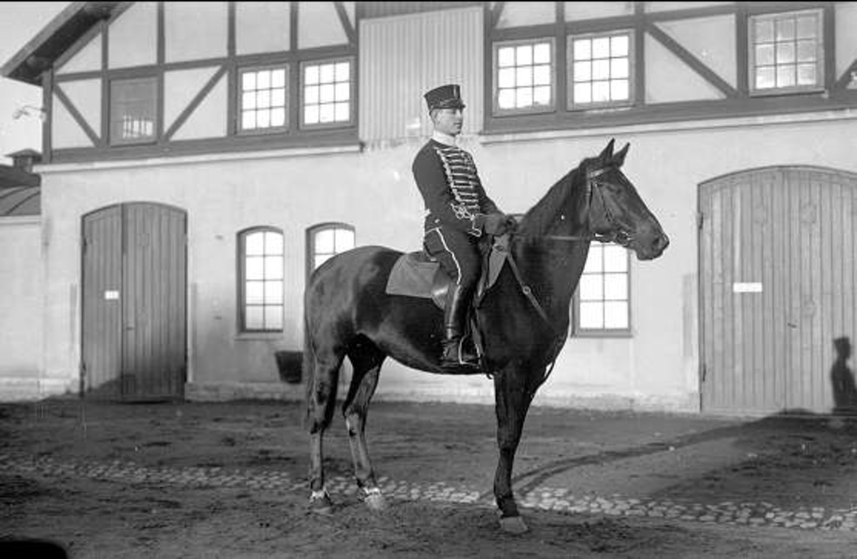 Livhusar på tilldelad stamhäst framför skvadronens stall.