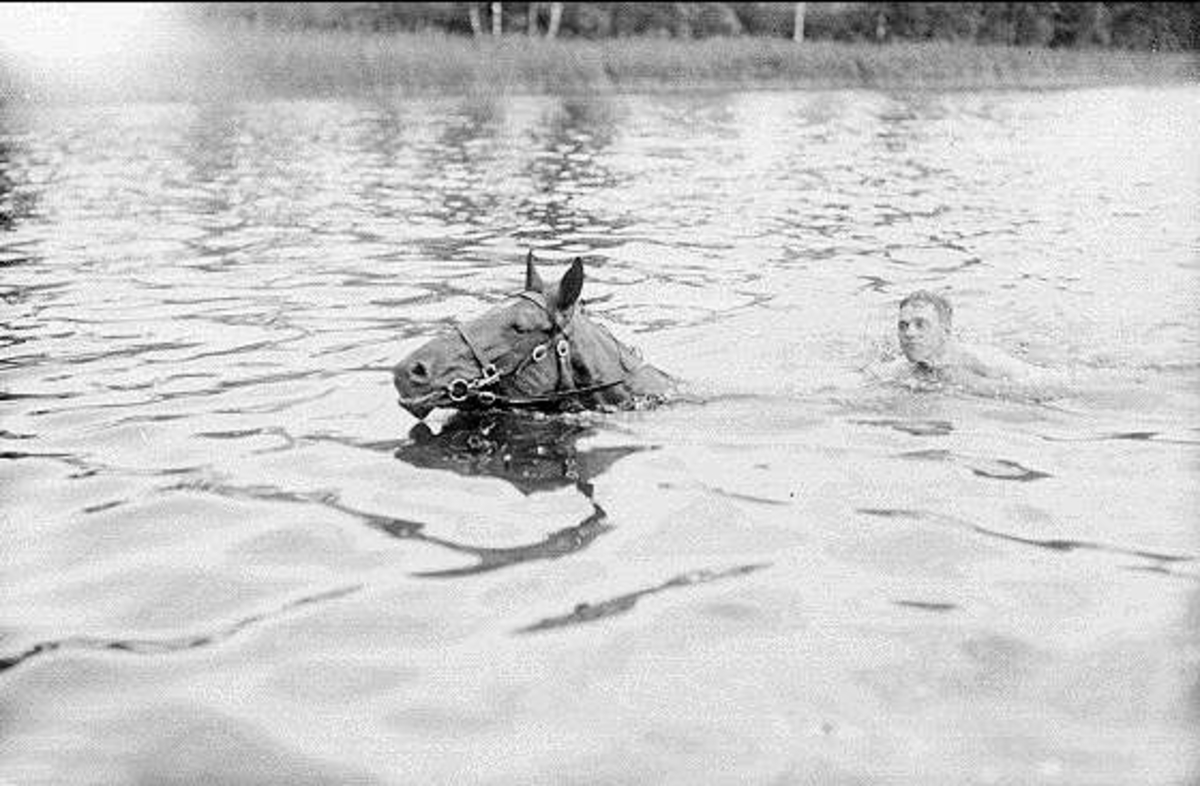 Simning vid Sjötorpssjön 2.skv skvch ryttm C-A Torén (senare sekundchef för K1), simmande korpral Johansson (Gunnehäll) med hästen Gullan E Gulasch - Fine.