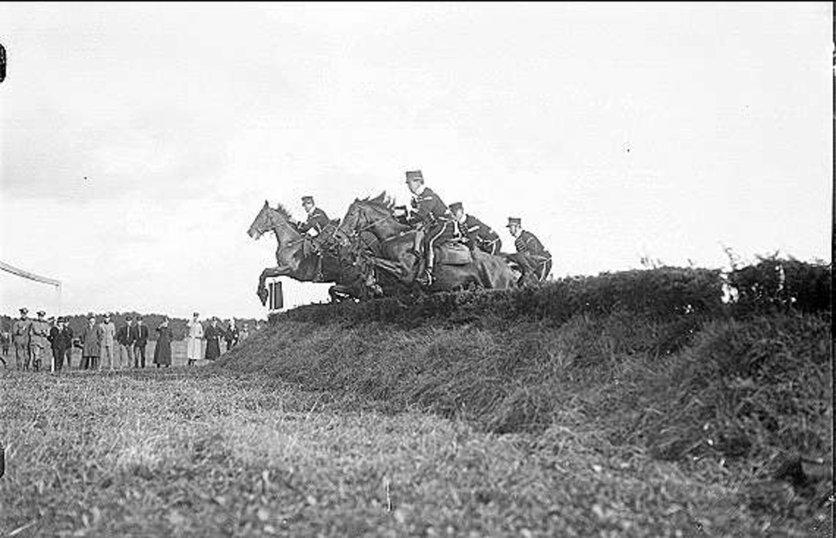 Regementskapplöpningarna 1928 på fältet söder K 3 kasern. Mastern har släppt fältet. Furirjaktloppets deltagare i full fart över jordvallen.