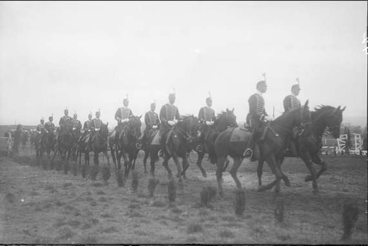 Titel: Kadrilj vid SFK:s vårtävlingar 1933 under ledning av löjtn. Sven Littorin. Deltagare musikkåren under musikfanj. C A Borgmans ledning samt 16 underbefäl vid regementet. Bilderna tagna delvis på kaserngården och delvis på prishoppningsbanan.