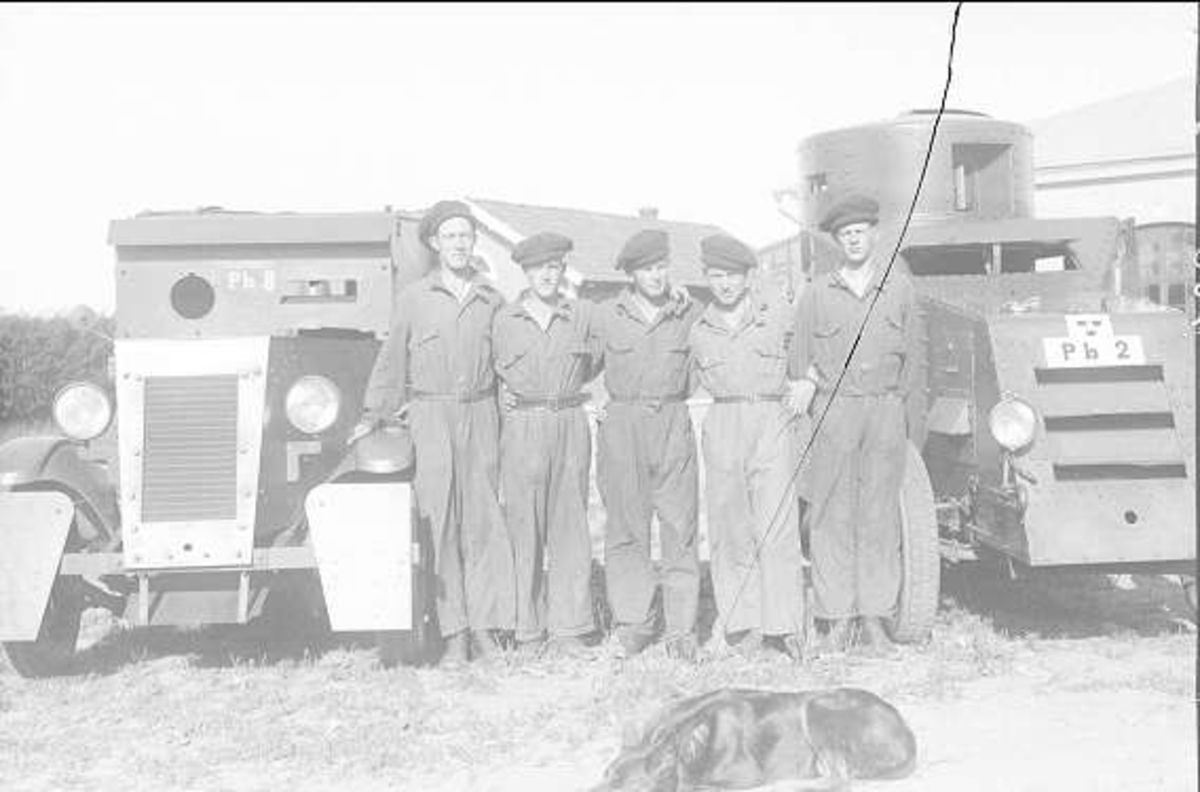 Kavalleriförsök med pansarbilar. Del av K 3 pansarbilavdelning med Sven von Essens hund Cajsa framför. Nu har baskern blivit fastställd huvudbonad för pansarbilpersonal.
