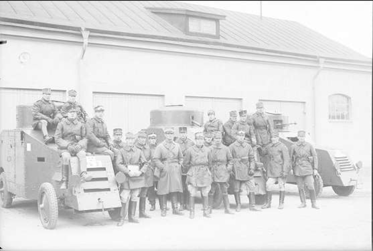Kavalleriförsök med pansarbilar. Befäl i centrum ryttmästare Wilhelm Odelberg, löjtnant Sven von Essen - dessa båda var utbildade pansarbilsbefäl. OBS! Nu är även skinnjackan införd vid pansarförband.