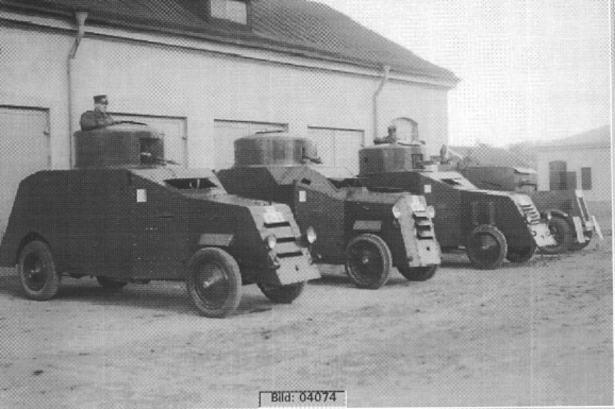 K3. Pansarbilavd uppställd framför motorfordonsgaraget. Till höger sjukstallet.