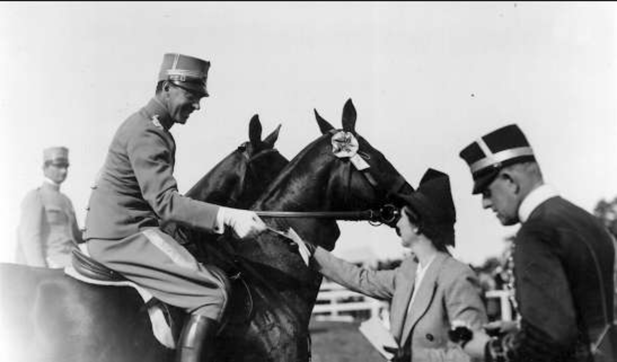 HKH prins Gusaf Adolf mottager pris av generalskan af Edholm vid sfk:s vårtävlingar 1934. Till höger i bild ryttm Peter von Essen K3 och till vänster löjtn Svante Bielke.