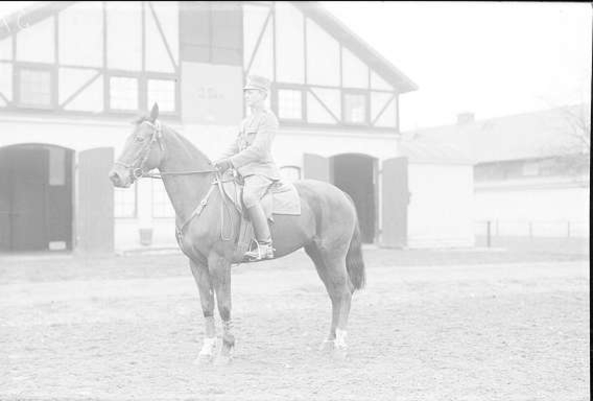 Underofficer med tilldelad tjänstebrukshäst söder skvadronsstallet.