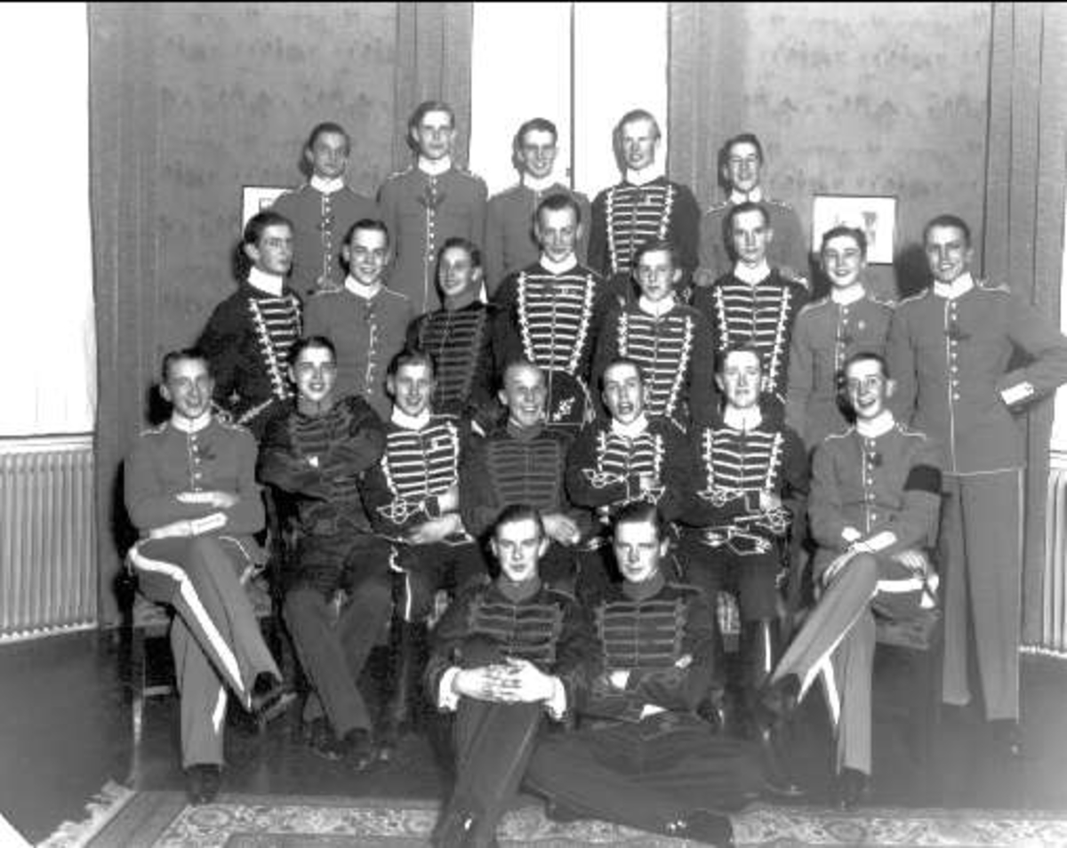Aspirantskola på K 3 1934 efter Hubertusjakten, Nov 1934 (obs grankvisten) Bl.a. Eric Sörensen(3:e raden längst till vänster), Stig Viktor Ljung (2:a raden 2:a från vänster), Hans Helge Rasmusen (2:a raden mitten).