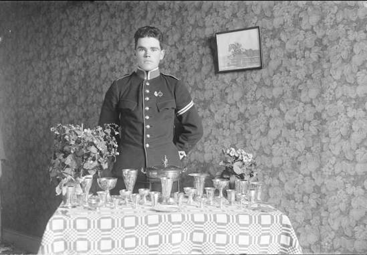 Furir i m/ä från annat förband vaktande prisbordet före prisutdelning.