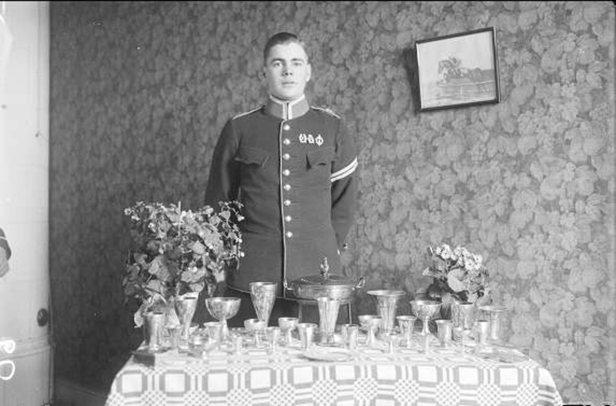 Furir i m/ä från annat förband vaktande prisbordet före prisutdelning.