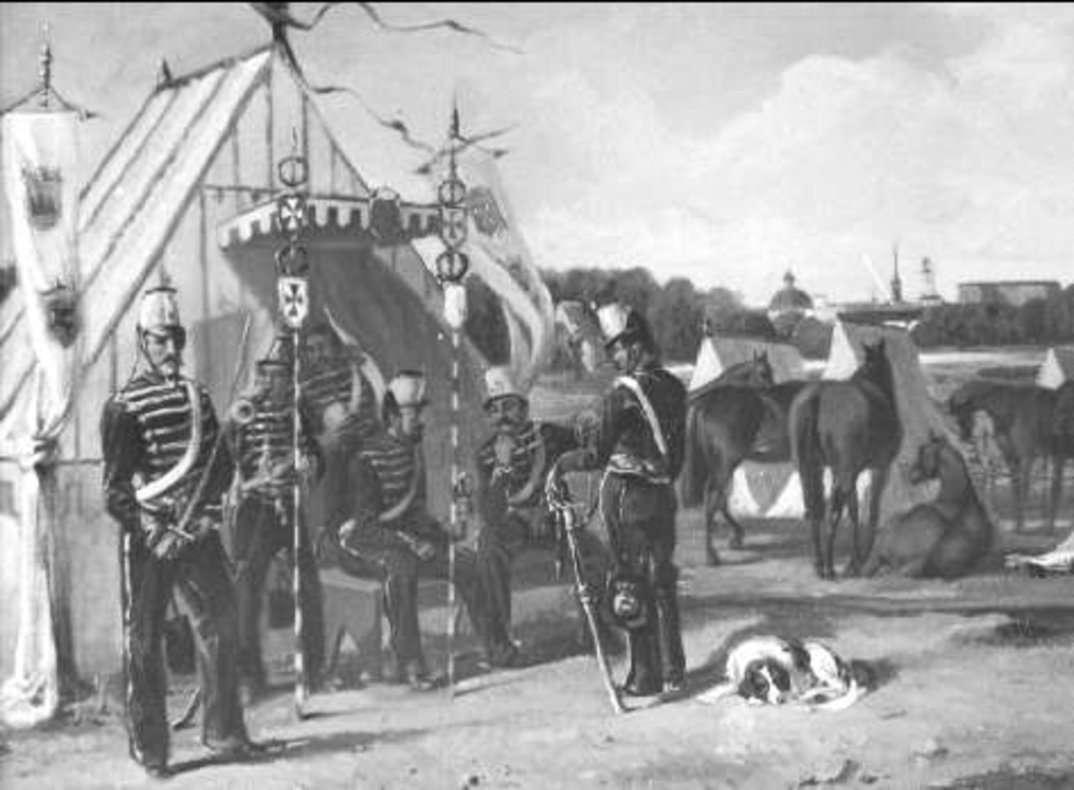 Tillhör offmässen K 3. Har tillhört ryttmästare Nils Gustaf Fock. Efter hans död har hans arvingar skänkt konstverket till livregementet husarers officerskår för att pryda deras samlingsrum i den nya kasernen i Skövde. Ruder i Tibro 22 aug 1905. Arvingarna. Vadsbo skv. (Arsenius) synes ha vakten.