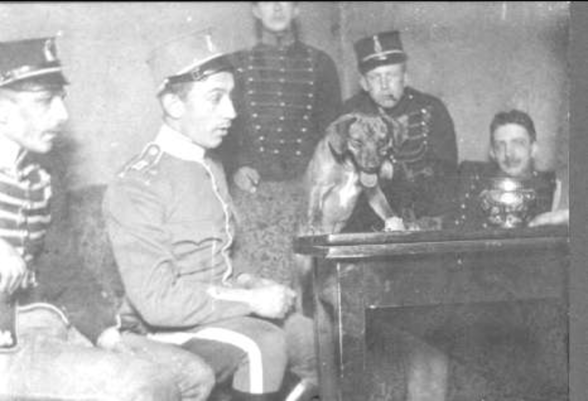 Från kavalleriskolan 1903-1904. Från vänster Hedenstierna, Hamilton, Frick, hunden Svensson leker med råttan, P de la Gardie, Mörnen.