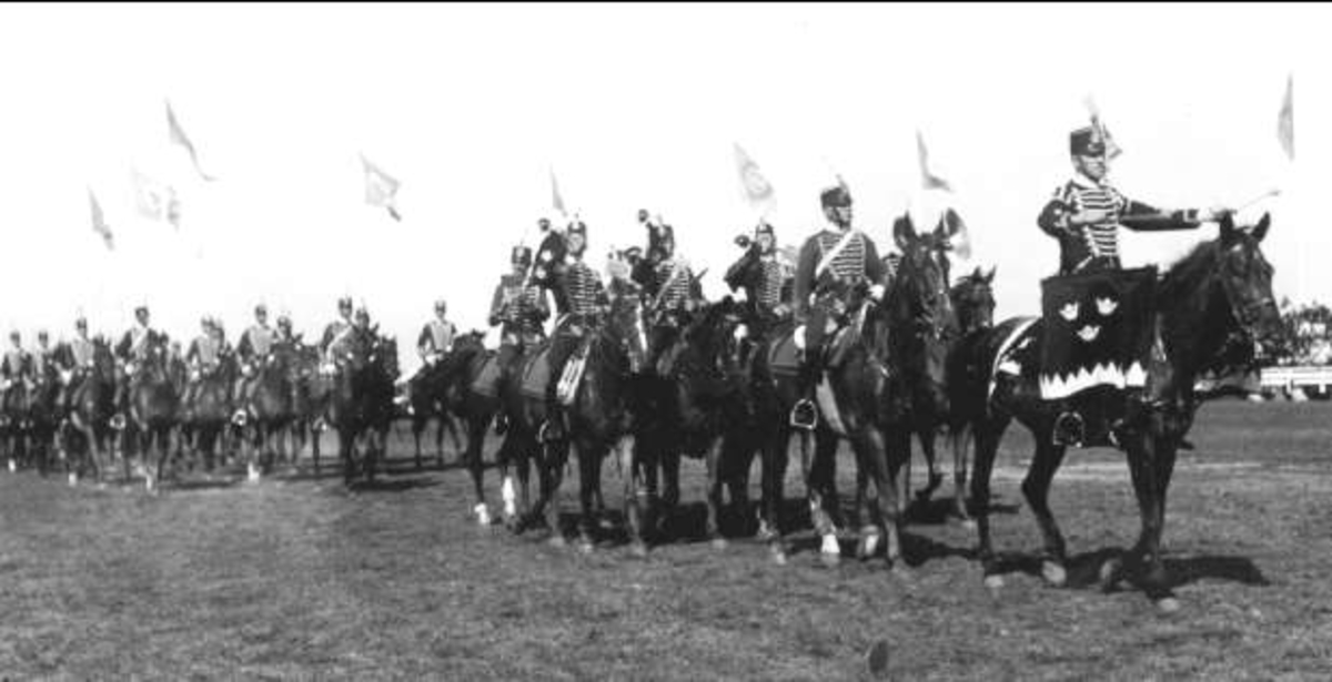 Musikkåren K 3, Skövde, vid prins Gustaf Adolfs och prinsessan Sibyllas besök 1935. Prinsens häst bröt nacken vid prishoppningstävlingarna.