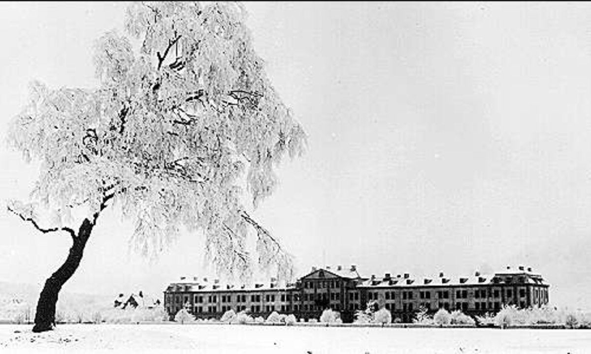 K 3 kasern i Skövde från söder, i förgrunden riktmärket "Lutande björken".