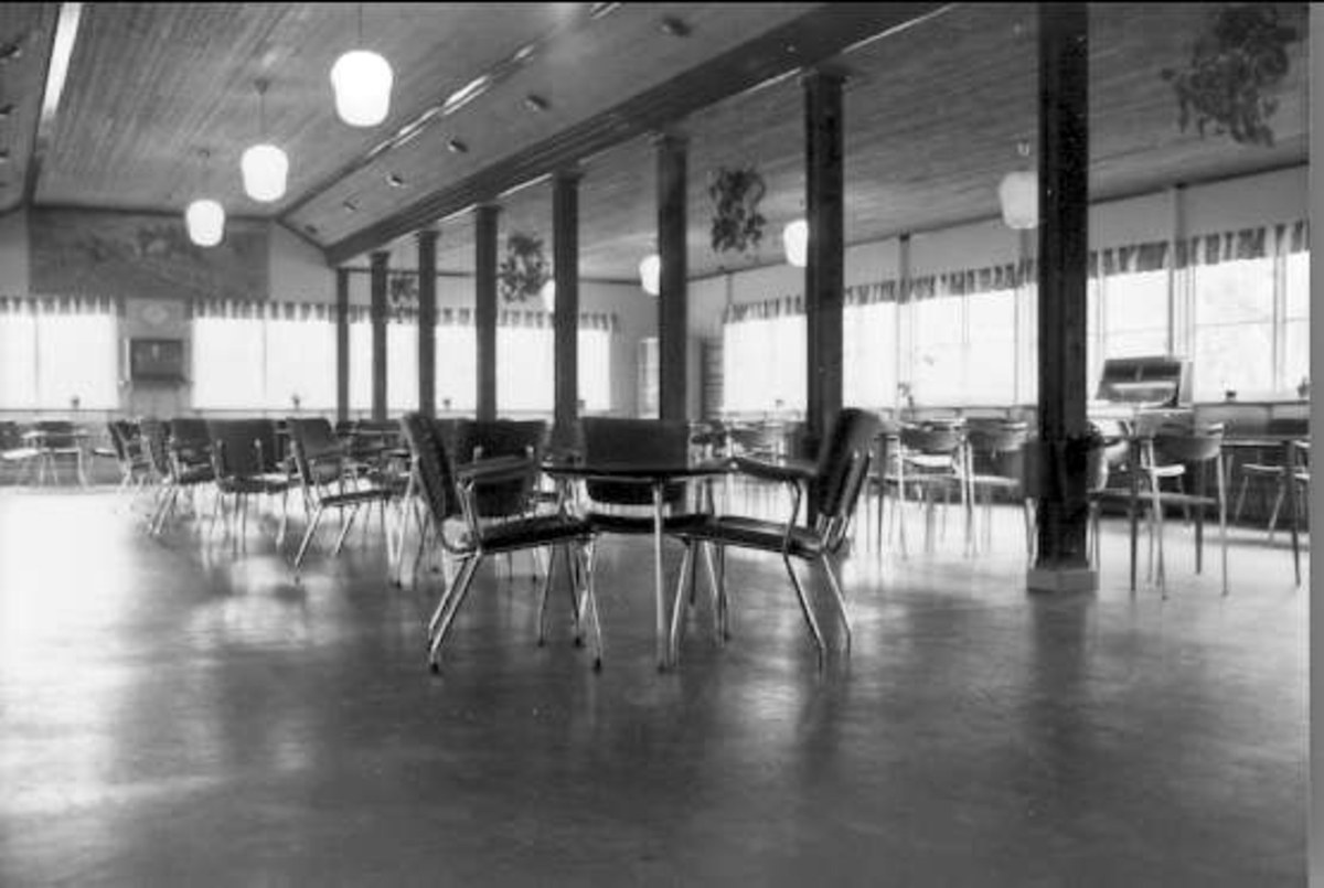 Manskapsmatsal på K 3 i Skövde. På 40-talet höll taket på att tyngas ned av snömassor. Därför stöttades det inifrån med tre rader stolpar. Kallades därefter allmänt för stolpladan.