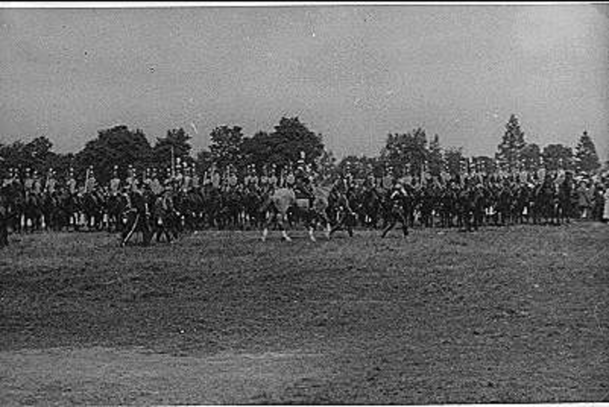 Invigningen av regementets minnessten på Sanna hed den 1 Augusti 1920. Efter avlämningen inspekterar HKH skvadronen åtföljd av Sekundchefen, Landshövdingen i respektive Örebro och Skaraborgs län, Kj Bergström och Axel Ekman, General Nyblaus och Adjutanten Överstelöjtnant Gustaf Leuhusen (Smålands husarer).