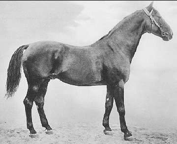 Halvblod, svenskfödd. Mörkbrun med vita bakfötter mankhöjd 159 cm. Fader Palikar. Moder Zorka efter Perleberg. Uppfödare friherre W. Wrangel von Brehmer, Hyby. Ägare Strömsholms Hingstdepå född 1900.