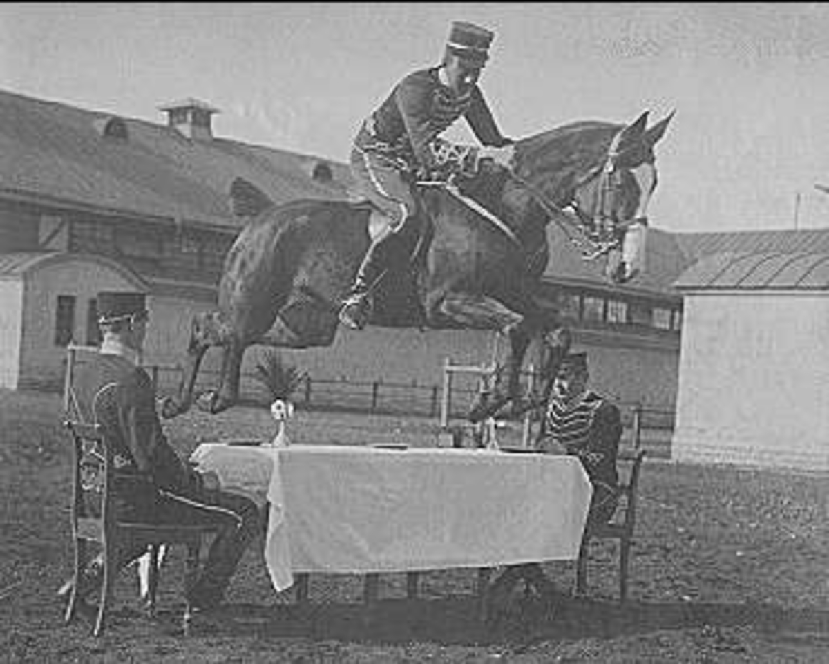 Henning Krafft övningshoppning/vänjningsövning på kaserngården K 3 i Skövde. Krafft blev senare en prishoppningsryttare i världsklass. Hedenstierna 1906-11. Kortet finns uppförstorat i entrén.