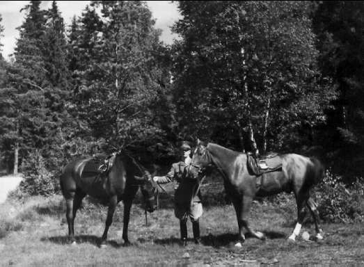 Sekundchefen med sina båda tjänstehästar i Tovatorps - terrängen.