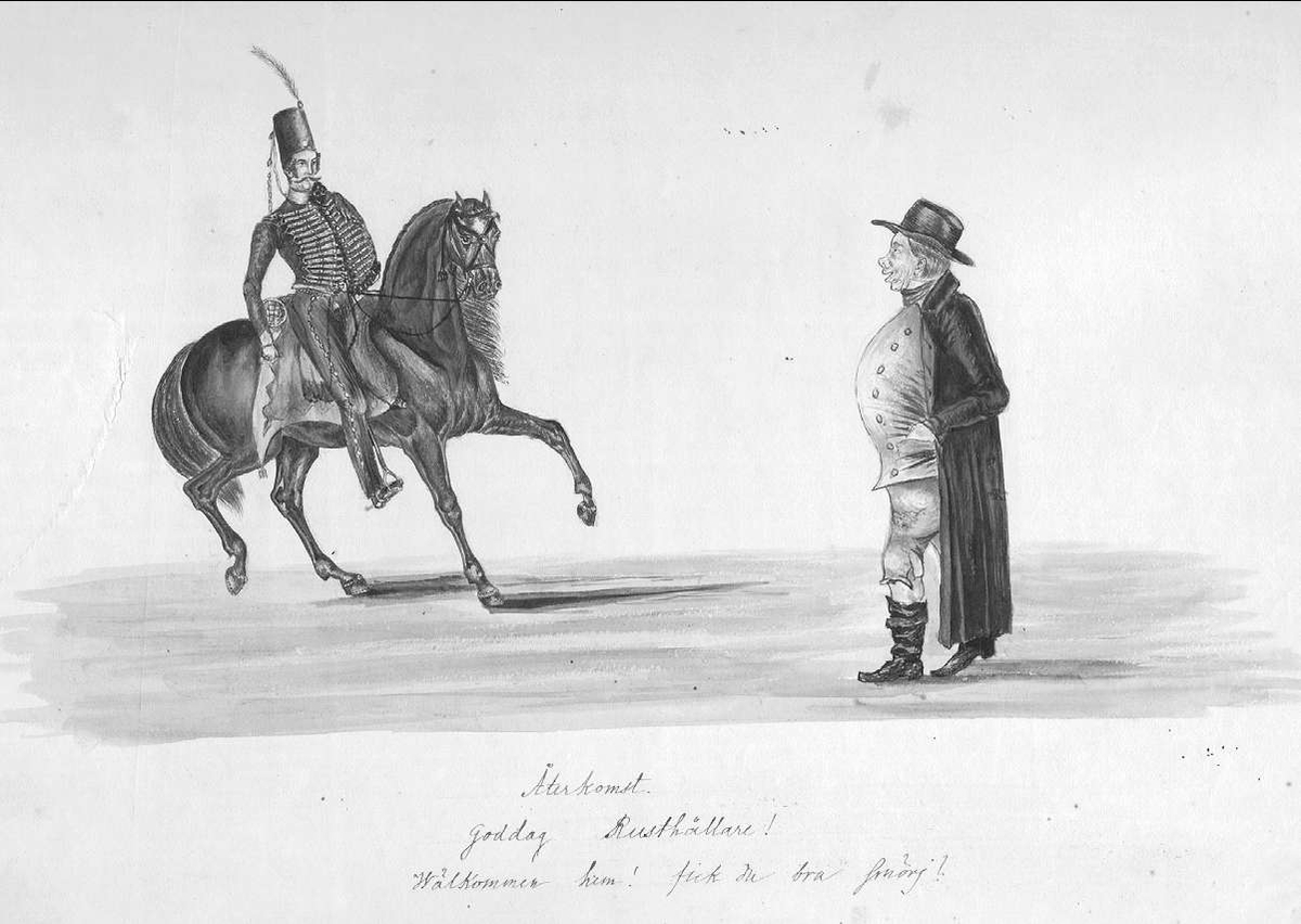 John Arsenius, född 1818. Officer vid K 3 1838-1868. Känd konstnär, framför allt hästmålningar. Söner: Georg -- Konstnär. Sam -- Officer, fältjägare. Återkomst. Goddag, Rusthållare! Välkommen hem! Fick du bra smörj?
