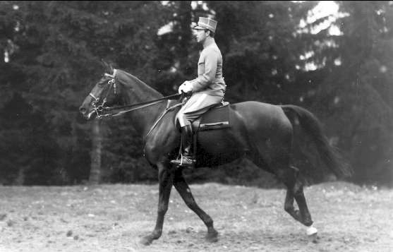 H K H prins Gustaf Adolf vid SFK:s vårtävlingar 1934 motionsrider en av sina tävlingshästar i tovatorpsterrängen.