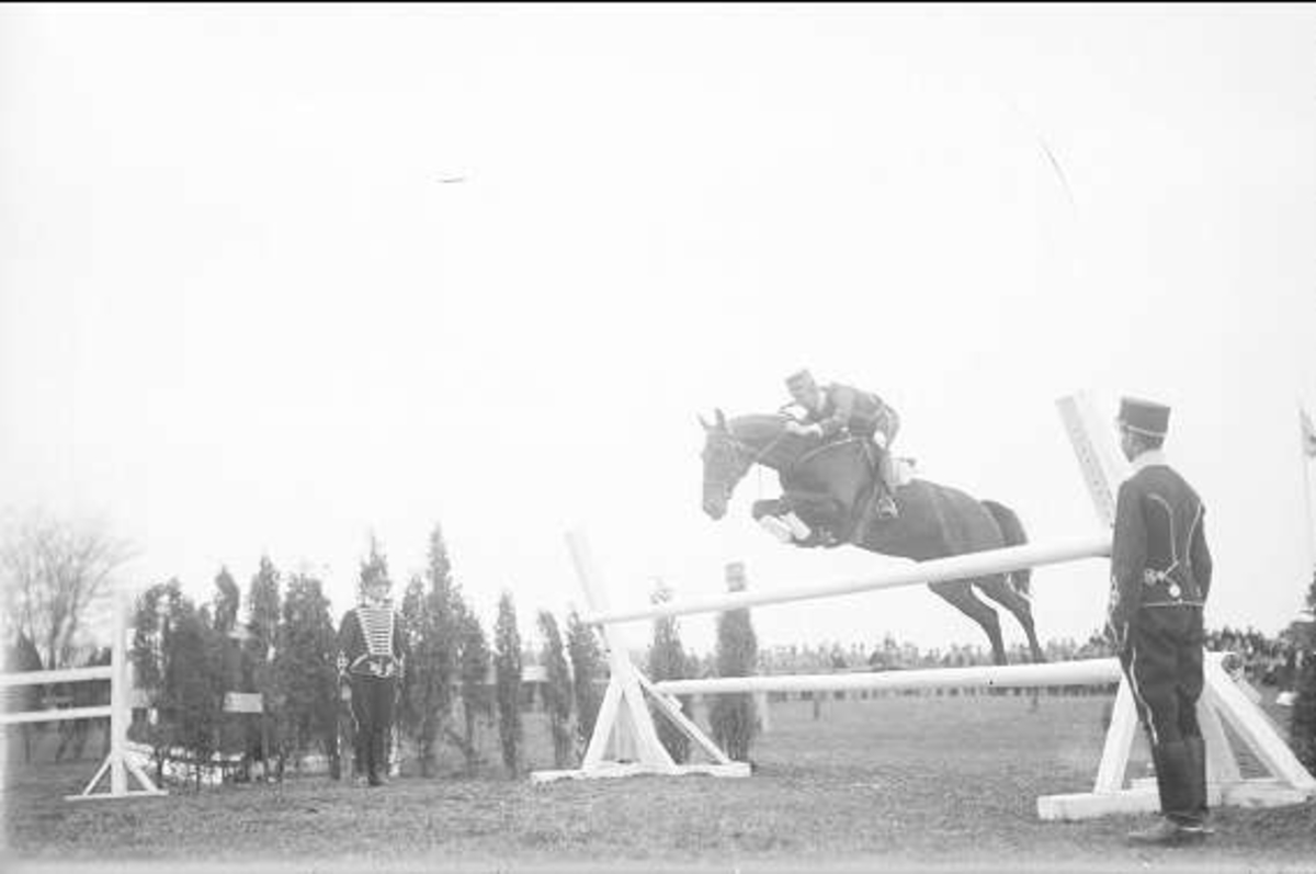 Skövde fältrittklubbs tävlingar 1932 på prishoppningsbanan öster kasern. På 30-40- talet var det stora åskådarmassor på SFK tävlingar: ofta c:a 4000 på lördagen och c:a 6000 på söndagen. Ev. 1930.