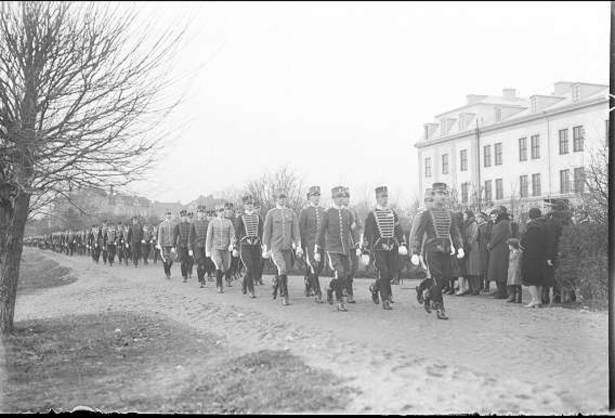 Regementet i förbimarsch för sekundchefen från soldathemmet tillbaka till kasern efter korum. Aspirantskolan med avdelningschef och skolans underbefäl från olika regementen i täten.