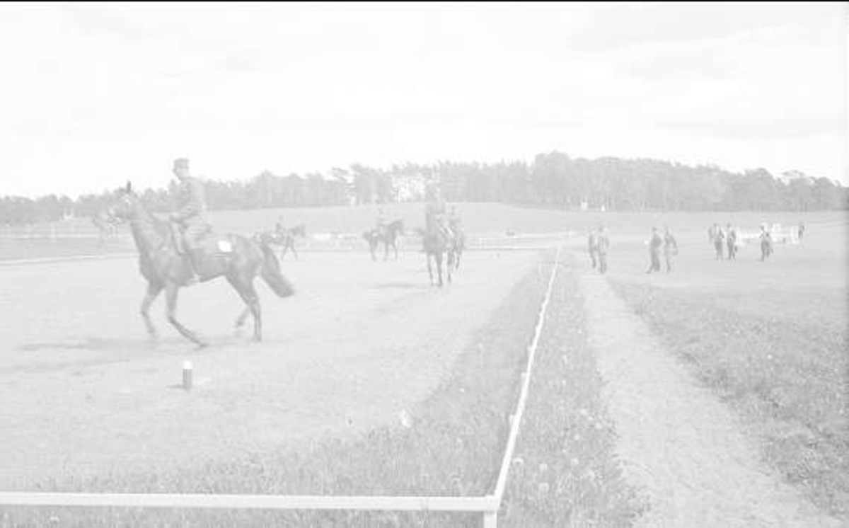 Kavalleriinspektör general G Gyllenstiernas inspektion av dressyrridning på dressyrbanan öster ridhuset. I bakgrunden Dunkehallshöjden.