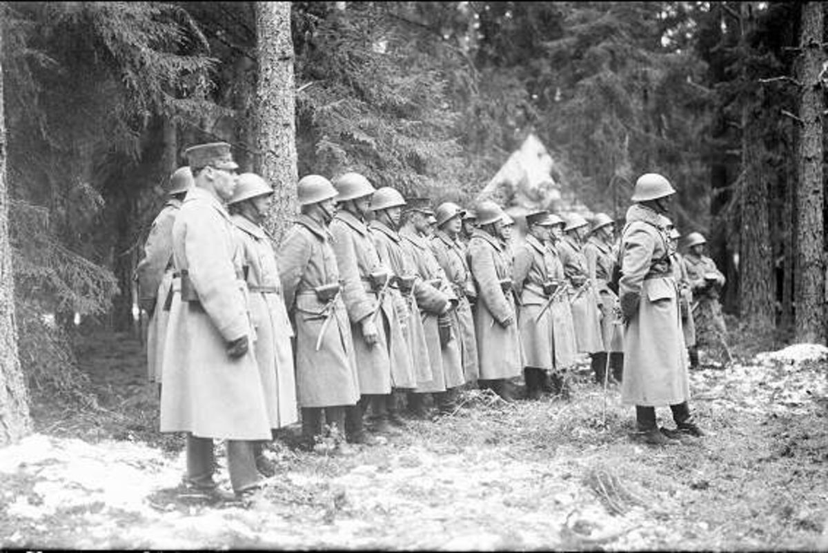 Utbildningskurs för kavalleriets underbefäl. Genomgång före/efter övning. Framför kursen löjtnant Folke Linton, på högra flygeln serg. E Tiberg.