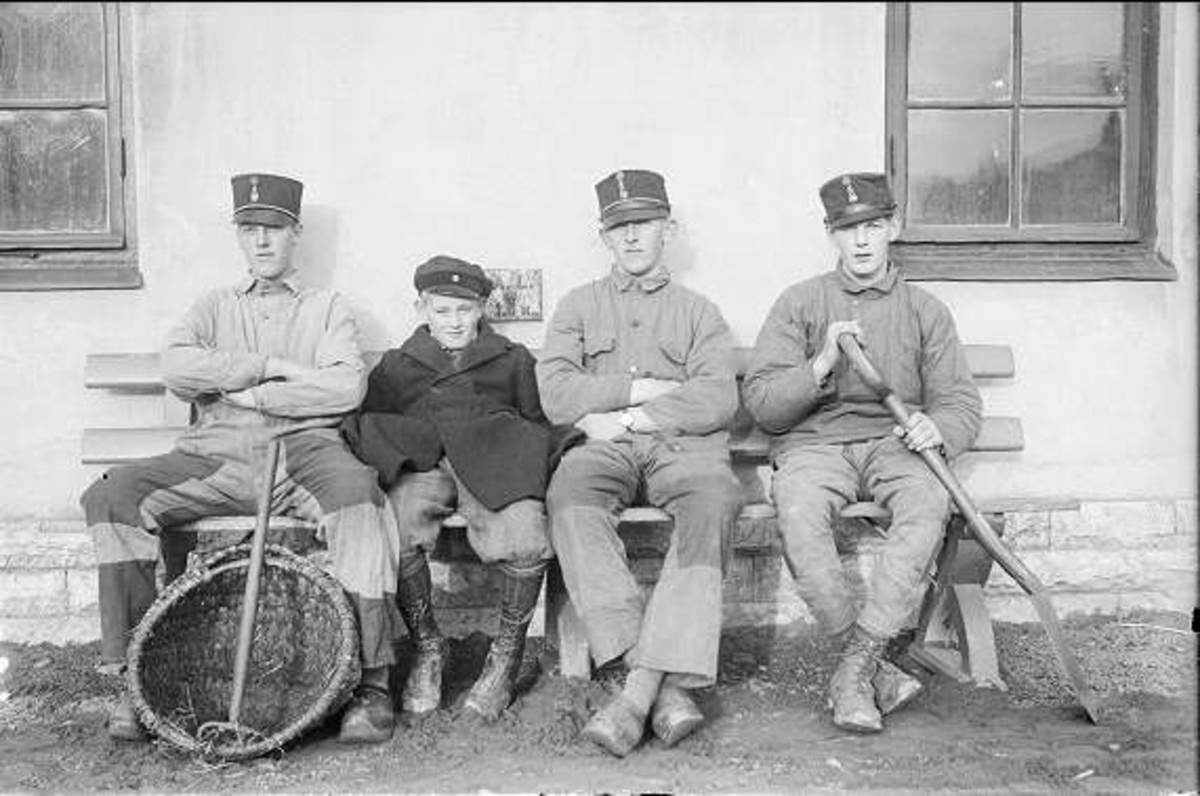 De tre stallposterna under rast utanför stallet, framför vänstra husaren gödselkorg och pilk. Så fort en häst förrättat sina behov skulle gödseln omedelbart tagas bort så att den ej stampades ner i halmbädden. Skolpojken kan vara Henning Odelberg, son till ryttm Wilhelm Odelberg.