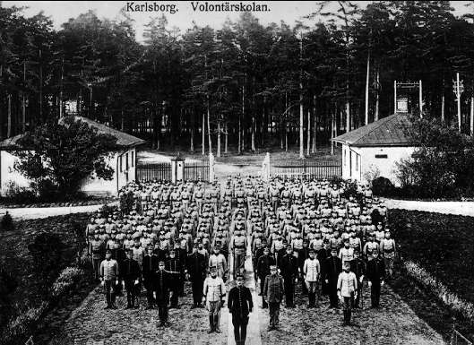 Infanterivolontärskolan Karlsborg, senare rekrytskolan för infanteriets off- och res. off. Aspiranter 1878 - 1927. Volontärskolan år 1923, framför vakten.